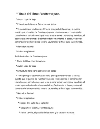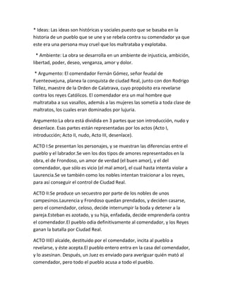 El resumen analiza la obra de teatro Fuenteovejuna de Lope de Vega. La obra trata sobre la justicia y cómo el pueblo de Fuenteovejuna se rebela contra su cruel comendador. Está dividida en tres actos que representan la introducción, el nudo y el desenlace de la historia. El pueblo finalmente asesina al comendador después de sus continuos abusos de poder.