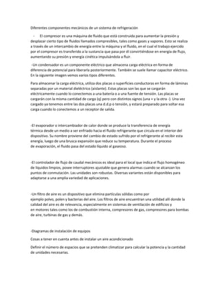 Este documento describe los diferentes componentes de un sistema de aire acondicionado, incluyendo el compresor, condensador, evaporador, filtro de aire y diagrama eléctrico. También describe los tipos de sistemas como split, cassete, ducto y central. Explica conceptos como expansión directa e indirecta. Finalmente, cubre temas de mantenimiento preventivo como limpieza de filtros y mantenimiento correctivo como reemplazo de piezas.