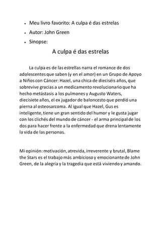Este documento resume el libro favorito del autor, La culpa es de las estrellas de John Green. Narra el romance entre dos adolescentes, Hazel y Augusto, que se conocen en un grupo de apoyo para niños con cáncer. A pesar de sus enfermedades, comparten un gran sentido del humor e inteligencia que les ayuda a enfrentar la enfermedad. El autor opina que es una obra ambiciosa y emocionante que trata sobre la alegría y la tragedia del amor.