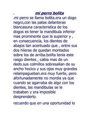 Este documento describe al perro de raza Dogo Argentino del autor llamado Bolita. Bolita tenía características típicas de su raza como mandíbula prominente y colmillos sobresalientes. A pesar de su apariencia fuerte, Bolita no mordía. En un incidente, Bolita agarró la oreja de un oso y no lo soltó a pesar de los intentos del oso por liberarse. Más tarde, cuando el autor dejó a Bolita encerrado para irse de viaje, Bolita rompió una ventana para escapar y siguió