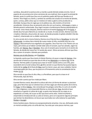 Dioniso era el dios griego del vino, la agricultura y el teatro. Tuvo un nacimiento prematuro debido a la celosía de Hera, la esposa de Zeus, y fue criado por diferentes figuras como Hermes, ninfas y reyes. Introdujo el cultivo de la vid y el vino en Grecia y Asia, aunque se enfrentó oposición de algunos príncipes. Era un dios asociado con la locura ritual, el éxtasis y la liberación de las preocupaciones mundanas a través del vino y la música.