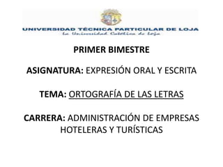 El documento proporciona instrucciones sobre el uso correcto de las letras b, v, c, s, z, h, g y j en el idioma español. Explica las reglas ortográficas para determinar cuando usar cada letra y provee ejemplos ilustrativos. El documento está dirigido a estudiantes de la carrera de Administración de Empresas Hoteleras y Turísticas.