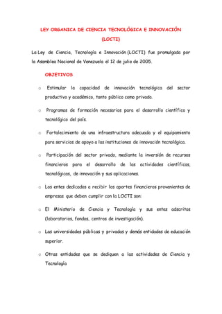 El documento describe el marco legal de la gestión tecnológica en Venezuela, incluyendo la Ley de Ciencia, Tecnología e Innovación que estimula la innovación tecnológica. También describe el Ministerio de Ciencia y Tecnología, los principales institutos de investigación como el IVIC y CENDES, los parques tecnológicos, y el INZIT que ofrece servicios de análisis e investigación tecnológica.