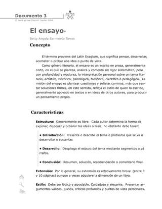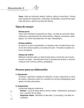 El documento define el ensayo como un escrito en prosa generalmente corto en el que se analiza y comenta sin rigor sistemático un tema literario, artístico, histórico o filosófico desde una perspectiva personal. Explica que el ensayo tiene una estructura libre que generalmente incluye una introducción, desarrollo y conclusión, y puede ser de diferentes tipos como puro, poético o de crítica. Finalmente, detalla el proceso de elaboración de un ensayo que implica la planeación, preparación y composición del