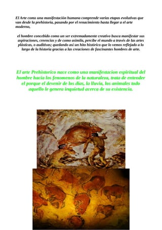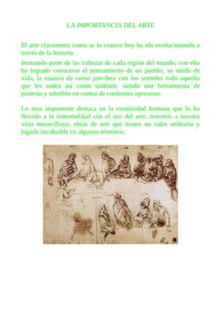 El documento describe la importancia del arte a través de la historia. El arte ha evolucionado y forma parte de cada cultura, permitiendo conocer el pensamiento y modo de vida de los pueblos. El arte también ha servido como herramienta de protesta. La creatividad humana a través del arte lo ha llevado a la inmortalidad, creando obras con valor utilitario e invaluable. El arte ha pasado por varias etapas evolutivas desde la prehistoria hasta el arte moderno, permitiendo que el hombre manifieste sus creencias a través de las artes.