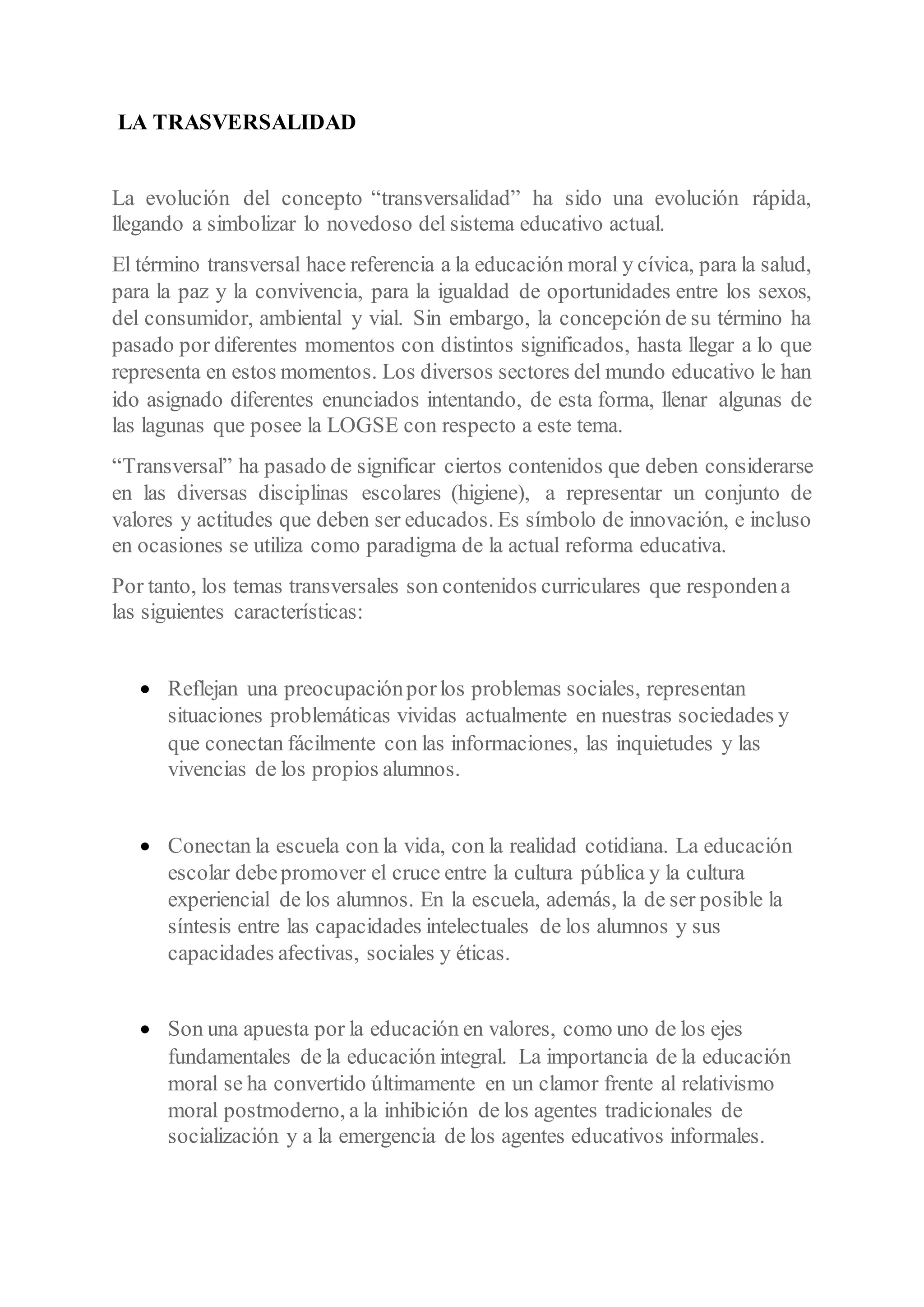 Los temas transversales son contenidos curriculares que reflejan preocupaciones sociales actuales, conectan la escuela con la vida real de los estudiantes y apuestan por la educación en valores. Han evolucionado para representar conjuntos de valores y actitudes en lugar de solo ciertos contenidos, y simbolizan la innovación en el sistema educativo actual.