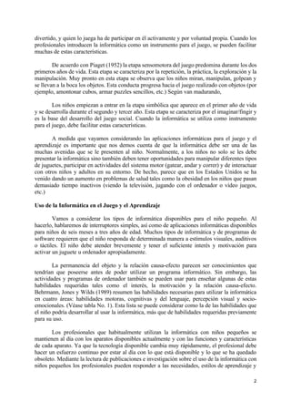1. El documento describe el uso de la tecnología como una herramienta para el juego y el aprendizaje en niños pequeños. Específicamente, discute cómo interruptores simples y ordenadores personales pueden usarse para que los niños desarrollen habilidades a través del juego. 2. También explica cómo la tecnología puede brindar oportunidades únicas para enseñar y mejorar las opciones de vida de los niños con discapacidades. 3. Finalmente, señala que la tecnología de asistencia debe introducirse