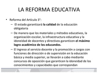 La evaluación del desempeño docente en México tiene como objetivo garantizar una educación de calidad mediante la valoración periódica del desempeño de los maestros y directores. Se evaluarán todos los maestros de educación básica y media superior del país a lo largo de tres años utilizando diversos métodos e instrumentos de evaluación. Los resultados de la evaluación determinarán oportunidades de formación continua, reconocimiento o cambios en el estatus laboral de los maestros.