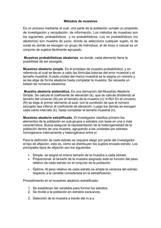 Este documento describe diferentes métodos de muestreo probabilísticos y no probabilísticos, incluyendo muestreo aleatorio simple, sistemático, estratificado y por conglomerado. Explica que el muestreo probabilístico implica que cada elemento tiene la posibilidad de ser seleccionado, mientras que en el no probabilístico los elementos no son seleccionados al azar. También discute el uso de tablas de números aleatorios para seleccionar muestras aleatorias de una población.