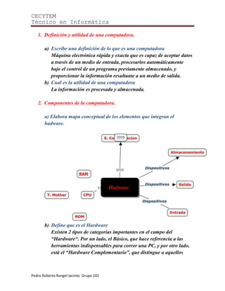 Este documento describe los componentes básicos de una computadora. Define una computadora como una máquina electrónica que procesa datos de entrada y los convierte en información de salida. Explica que el hardware incluye el monitor, teclado, mouse y CPU, con componentes internos como la tarjeta madre, procesador y memoria. Distingue la memoria RAM, que es de acceso aleatorio y lectura-escritura, de la ROM, que es de sólo lectura y permanente. Finalmente, señala que los dispositivos de almacenamiento secundario como las
