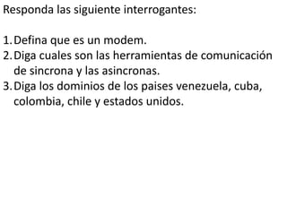 Un modem inalámbrico se conecta a una red inalámbrica en lugar de a la red telefónica. Las herramientas de comunicación síncrona permiten interactuar en tiempo real como chats de texto y voz, mientras que las herramientas asíncronas como el correo electrónico no requieren estar en línea al mismo tiempo. Los dominios de Venezuela, Cuba, Colombia, Chile y Estados Unidos son .ve, .cu, .co, .cl y .us respectivamente.