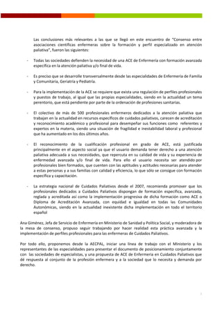 El documento aboga por la creación de un área de capacitación específica en enfermería para la atención a pacientes en procesos paliativos, respaldado por la necesidad de formación avanzada para mejorar la calidad de vida de estos pacientes y sus familias. Durante un encuentro en Madrid, diversas sociedades científicas apoyaron la implementación de esta capacitación, destacando la demanda social de atención paliativa adecuada y la actual falta de reconocimiento profesional para enfermeros dedicados a esta área. Se propone seguir colaborando con el ministerio para formalizar un documento que atienda las necesidades de los enfermeros y la sociedad en general.