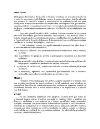 El Programa Nacional de Formación en Turismo tiene como objetivo formar profesionales integrales en el área del turismo para que se incorporen a equipos interdisciplinarios responsables de organizar, planificar, ejecutar, controlar y evaluar los servicios y recursos turísticos de manera de brindar una experiencia de calidad a los turistas. El programa busca formar talento humano para el desarrollo sustentable de la industria turística considerando su importancia económica para Venezuela.