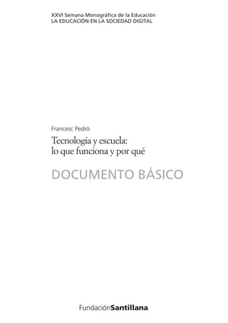 Este documento analiza cómo la tecnología puede usarse efectivamente en la educación escolar. Examina las razones por las cuales la tecnología es importante en la escuela, el estado actual de su uso, y ofrece una visión de hacia dónde debería dirigirse su uso para mejorar el aprendizaje. El documento concluye con recomendaciones sobre cómo implementar efectivamente la tecnología en el aula y en la escuela para lograr que los estudiantes aprendan más, mejor y de manera diferente.