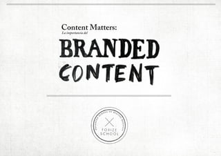 El documento habla sobre el auge del Branded Content como una nueva forma para que las marcas se conecten con los consumidores. Explica que el Branded Content permite acercar la marca al consumidor a través de experiencias atractivas sin ser tan invasivas como la publicidad tradicional. También discute cómo el Branded Content y la publicidad tradicional coexisten actualmente y podrían evolucionar en el futuro para perseguir objetivos distintos.