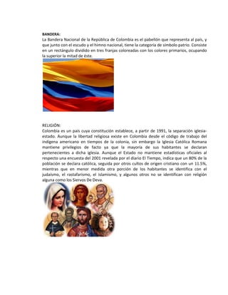 Colombia es un país ubicado en el noroeste de América del Sur con costas en el océano Pacífico y el mar Caribe. Es la cuarta nación más extensa de Sudamérica y la tercera más poblada de América Latina. Colombia tiene una economía diversificada basada en la producción de café, flores, esmeraldas, carbón y petróleo, y es reconocida por su biodiversidad cultural. La moneda oficial es el peso colombiano y sus símbolos patrios son la bandera tricolor, el escudo de armas y