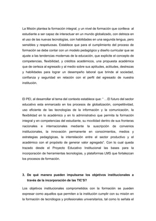 Este documento presenta un diagnóstico de la incorporación de las TIC en los procesos educativos de la Institución Universitaria Colegio Mayor del Cauca. Describe la trayectoria tecnológica de la institución desde 1995, incluyendo la creación del grupo de investigación HEVIR en 2006. También detalla logros, dificultades y retos relacionados con los procesos educativos, organizacionales, culturales e infraestructura. Finalmente, señala que el plan de desarrollo institucional incluye políticas en áreas
