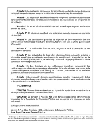 Este acuerdo establece normas de evaluación del aprendizaje en educación primaria, secundaria y normal. Señala que la evaluación debe realizarse a lo largo del proceso educativo y conducir a decisiones pedagógicas para asegurar la eficiencia de la enseñanza. Asigna una escala numérica del 5 al 10 para calificar y establece que los estudiantes aprobarán una asignatura con un promedio mínimo de 6. También deroga acuerdos anteriores que se opongan a lo establecido.