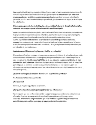 El ministro del Interior ha tenido éxito en combatir a Sendero Luminoso después de un año en el cargo, lo que le ha dado estabilidad a pesar de las acusaciones de corrupción. Ahora, su principal preocupación es la corrupción policial, y anuncia una reforma profunda para separar a los policías involucrados en actos irregulares mediante una evaluación cuidadosa de cada caso de manera progresiva. El ex inspector general de la policía está siendo investigado, lo que muestra la determinación de no tolerar la corrupción sin importar el rango.