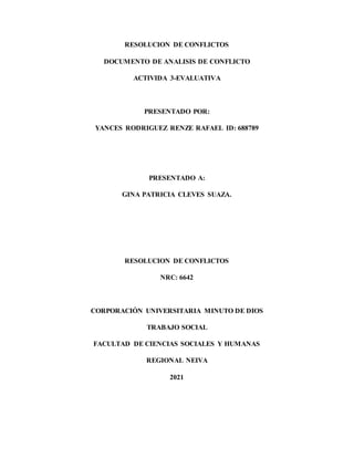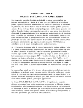 El documento analiza el conflicto armado en Colombia, sus orígenes desde 1946, y la evolución hasta la búsqueda de paz y resolución a partir de 2016. Destaca la violencia sistemática, el impacto en las víctimas, especialmente mujeres, y la necesidad de un enfoque integral para abordar la reparación y la reconciliación. Se aboga por el perdón, la participación de la sociedad civil y el papel del estado en la restauración de derechos y construcción de un futuro sin violencia.