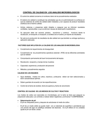 El documento trata sobre el control de calidad en los análisis microbiológicos. Explica que el control de calidad incluye monitorear diariamente los procedimientos para asegurar resultados precisos y confiables. También describe factores que influyen en la calidad como el cumplimiento de protocolos, la calibración de equipos, y el manejo adecuado de muestras, medios de cultivo e insumos. Finalmente, presenta tablas con ejemplos de cómo controlar el funcionamiento de equipos, medios de cultivo y pruebas