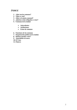 Las comunas son las nuevas unidades de gobierno local en la Ciudad de Buenos Aires. Cada comuna será gobernada por una Junta Comunal de 7 miembros electos por votación. El 5 de junio de 2011 se realizarán las primeras elecciones para las Juntas Comunales, que administrarán presupuestos propios y proveerán servicios a nivel barrial.