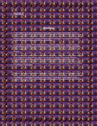 El documento describe la historia y tradiciones del Día de Muertos en México. Sus orígenes se remontan a las celebraciones de los antiguos pueblos mesoamericanos como los aztecas y mayas, quienes honraban a sus ancestros fallecidos. Tras la conquista española, la festividad se trasladó a inicios de noviembre para coincidir con las celebraciones católicas del Día de Todos los Santos y las Almas. Hoy en día, el Día de Muertos es una celebración a