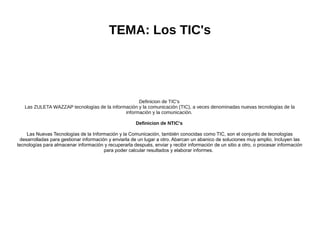 Este documento define las TIC (tecnologías de la información y comunicación) y las NTIC (nuevas tecnologías de la información y comunicación), explica las diferencias entre ellas, y describe las ventajas, desventajas y características de las TIC. Las TIC se refieren a herramientas como sistemas de telecomunicaciones e informática, mientras que las NTIC incluyen también tecnologías inalámbricas. Ambas son importantes herramientas que facilitan la comunicación y el acceso a la información, aunque también pueden
