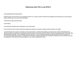 Diferencia entre TIC'sy los NTIC's LAS DIFERENCIAS PRINCIPALES Podemos decir que las NTIC son la evolución de las TIC. Es decir, anterior mente las tecnologías de información y la comunicación hacían referencia a una serie de herramientas: • Sistemas de Telecomunicaciones • Informática • Herramientas ofimática que contribuyen a la comunicación Por otro lado, las NTIC hacen referencia a todas las anteriores y además a todas las que funcionan sin cables. La denominación de “nuevas” ha traído no pocas discusiones y criterios encontrados, al punto de que muchos especialistas han optado por llamar simplemente Tecnologías de Información y Comunicación (TIC). Razón cuando comprobamos que muchas de ellas son realmente ancianas como el teléfono que data de 1876. Lo que no puede perderse de vista es que el término (nueva) se le asocia fundamentalmente porque en todas ellas se distinguen transformaciones que erradican la definición de sus antecesores y por su integración como técnicas interconectadas en una nueva configuración física.