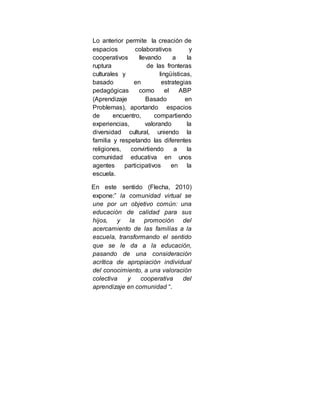 El documento discute cómo la interculturalidad puede aplicarse en el ámbito pedagógico utilizando las TIC como una estrategia para fortalecer la educación. Esto permite crear espacios colaborativos que rompen fronteras culturales y lingüísticas mediante estrategias como el aprendizaje basado en problemas. De esta forma, las comunidades educativas se convierten en agentes participativos que unen a las familias y respetan la diversidad para lograr una educación de calidad.
