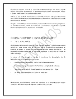 Este documento describe los problemas más comunes en el control de inventarios en pequeñas empresas, como la falta de registros, y proporciona pasos para establecer un sistema básico de control de inventarios utilizando el método ABC. El método ABC clasifica los productos en categorías A, B y C según su valor y volumen de ventas. Se recomienda llevar registros detallados de los productos A y B, que representan la mayor parte del valor del inventario, y controlar los productos C de forma más sencilla.