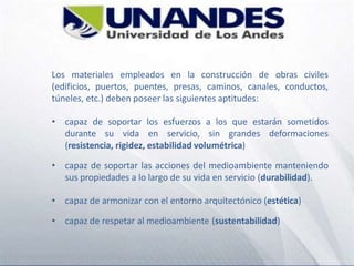 El documento proporciona información sobre los materiales utilizados en la construcción civil. Define los términos material, obra y materia. Explica que los materiales deben soportar esfuerzos y condiciones ambientales a lo largo de su vida útil, manteniendo sus propiedades, y deben armonizar con el entorno y respetar el medioambiente. Además, describe la ciencia, tecnología e ingeniería de los materiales y cómo estudian la relación entre estructura y propiedades.