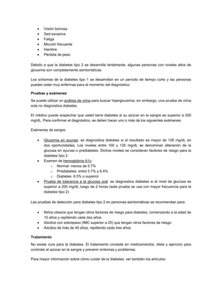 La diabetes es una enfermedad crónica caracterizada por altos niveles de azúcar en la sangre. Puede ser causada por una deficiencia de insulina producida por el páncreas o por resistencia a la insulina. Existen tres tipos principales de diabetes - tipo 1, tipo 2 y gestacional durante el embarazo. La diabetes no tiene cura y requiere control del azúcar en la sangre mediante medicamentos, dieta y ejercicio para prevenir complicaciones graves a largo plazo como daño a los ojos, riñones, nervios y p