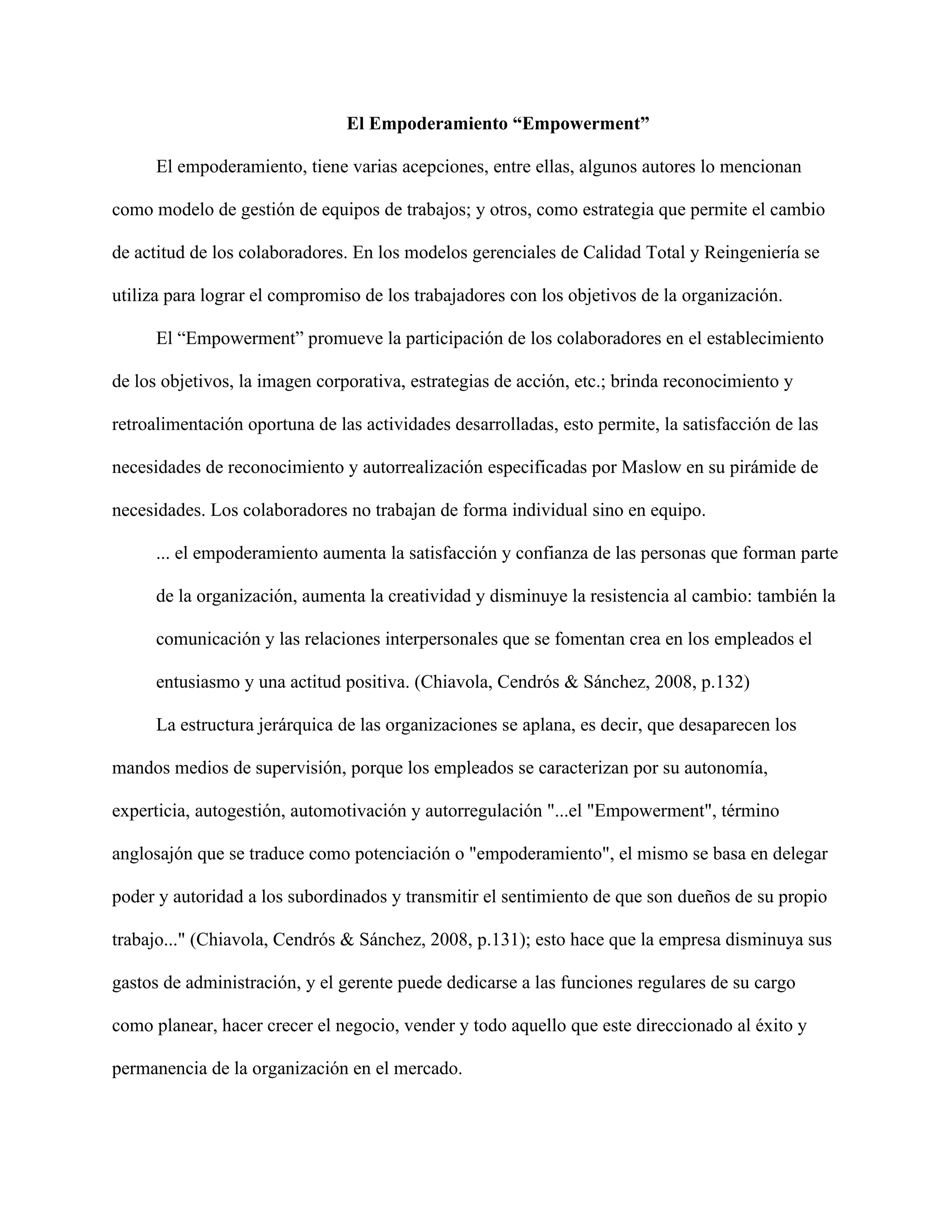 El documento habla sobre el concepto de empoderamiento en el contexto empresarial. Explica que el empoderamiento promueve la participación de los empleados en la toma de decisiones y objetivos de la empresa. También aumenta la satisfacción, confianza y creatividad de los empleados. Las empresas que usan este modelo aplanan su estructura jerárquica para dar más autonomía a los empleados.