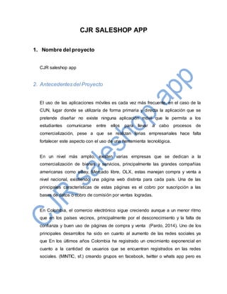 Este documento propone el desarrollo de una aplicación móvil para fomentar el comercio entre estudiantes de la CUN. Actualmente no existe una herramienta que permita a los estudiantes comunicarse para llevar a cabo procesos de comercialización. El objetivo es identificar las expectativas de los estudiantes sobre una aplicación y los recursos disponibles para desarrollarla, con el fin de implementar una plataforma que promueva un círculo económico en la universidad.