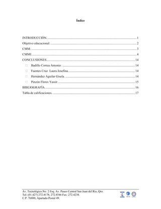 Este documento presenta un proyecto sobre el Estándar CMMI realizado por cuatro estudiantes del Instituto Tecnológico de San Juan del Río. Incluye una introducción al modelo CMMI y sus niveles de madurez, así como conclusiones individuales de cada estudiante.