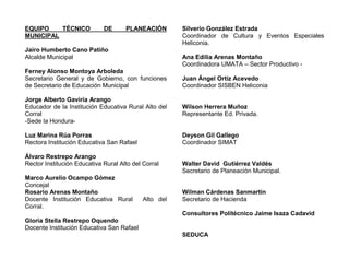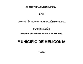 Este documento presenta el Plan Educativo Municipal del municipio de Heliconia para el periodo 2010-2020. El plan fue desarrollado por un Comité Técnico de Planeación Municipal con asesoría externa. El plan se basa en cuatro líneas de política: cobertura, calidad, pertinencia y eficiencia interna. El objetivo general es mejorar la educación en el municipio a través de estrategias como aumentar la cobertura educativa, mejorar la infraestructura escolar, y desarrollar currículos pertinentes. El plan busca log