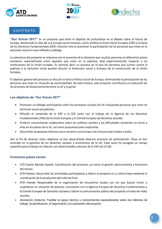 El proyecto 'Our Voices 2017' busca promover la participación de personas en situación de pobreza y exclusión social en el debate sobre la política social de Europa, destacando su importancia para reducir el distanciamiento con las instituciones de la UE. A través de un diagnóstico participativo, se identificaron barreras al acceso al empleo formal, resaltando la necesidad de reconocer el trabajo informal y fomentar un enfoque inclusivo en las políticas laborales. Se concluye que las soluciones institucionales actuales son insuficientes y que el sistema lleva a la estigmatización y vulnerabilidad de quienes solicitan ayuda.