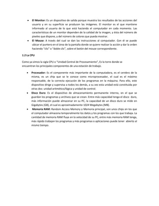 Este documento describe los componentes básicos de un computador personal, incluyendo la CPU, teclado, monitor, mouse y otros dispositivos. Explica cómo encender y apagar el computador correctamente, y describe los elementos clave del escritorio como iconos, barras de tareas y menú inicio. También cubre cómo modificar la fecha y hora, y organizar y personalizar el escritorio.