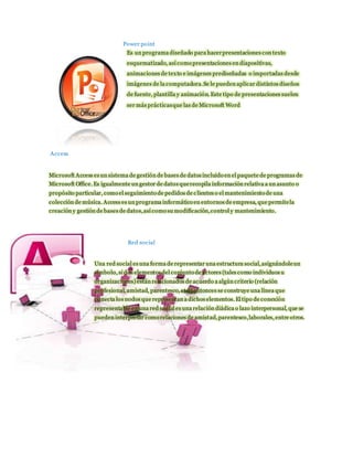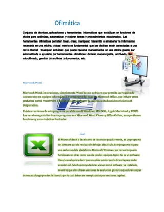 Microsoft Word es un software de procesamiento de texto que permite crear documentos. Forma parte del paquete Microsoft Office junto con otros programas como Excel y PowerPoint. Excel es un programa de hojas de cálculo mientras que PowerPoint se usa para crear presentaciones. Los antivirus son programas diseñados para proteger los sistemas de virus y malware.
