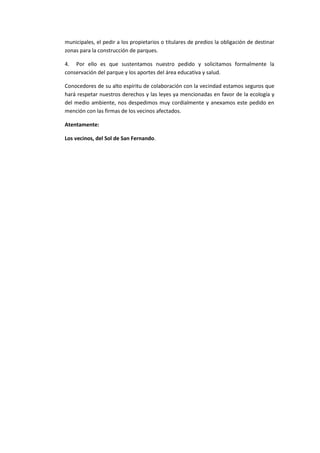 Los vecinos de la Asociación de Vivienda El Sol de San Fernando le escriben al alcalde Hugo Ramos para expresar su preocupación por los planes de construir un local comunal en el parque No04 de su urbanización. Argumentan que (1) se les prometió un parque cuando compraron sus casas y (2) el parque estaba designado como área verde en los planos aprobados. Citando varias leyes, piden formalmente que se conserve el parque debido a su importancia para la salud y el medio ambiente.