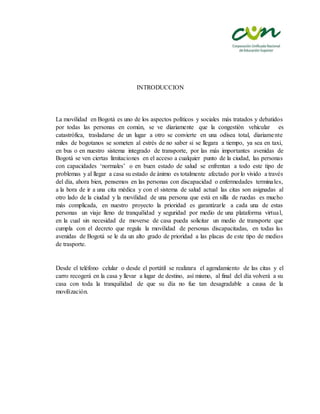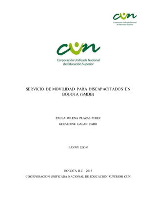 Este documento describe un nuevo servicio de movilidad para personas con discapacidad en Bogotá llamado SMDB. El servicio permitirá a los clientes programar citas médicas u otros viajes a través de una plataforma en línea o una aplicación móvil. Los vehículos especializados recogerán a los clientes en sus casas y los llevarán a sus destinos de una manera segura y puntual. El objetivo es mejorar la calidad de vida de las personas con discapacidad al facilitar su movilidad de una forma más cómoda y tranqu