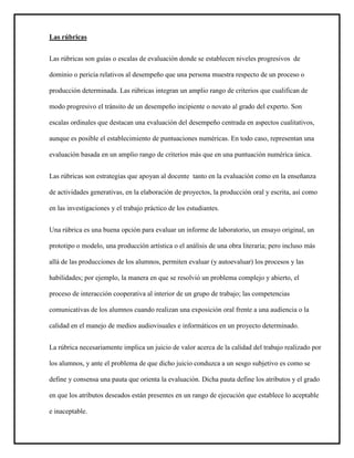 Este documento describe las rúbricas como herramientas de evaluación que establecen criterios y niveles progresivos de desempeño. Explica que existen rúbricas comprensivas y analíticas, y proporciona pasos para elaborar rúbricas efectivas. Finalmente, destaca que las rúbricas deben enfocarse en criterios significativos y ser claramente comunicables para los estudiantes.