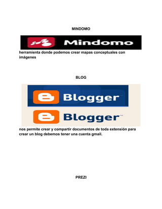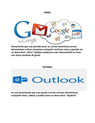 Gmail permite enviar correos electrónicos, compartir archivos y documentos en línea con otros usuarios de Gmail utilizando el disco duro Drive. Hotmail ayuda a compartir correos electrónicos, fotos, videos y audios utilizando el disco duro Skydrive. Mindomo permite crear mapas conceptuales con imágenes. Los blogs permiten crear y compartir documentos de cualquier extensión utilizando una cuenta de Gmail. Prezi facilita crear presentaciones interactivas con imágenes, audios, videos y diseños de fondos. SlideShare permite sub