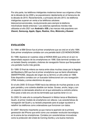 Este documento resume la evolución de los teléfonos inteligentes desde 1994 hasta la actualidad. Describe los primeros modelos como el IBM Simon en 1994 y el Nokia 9000 en 1996, y cómo se popularizaron a partir de 2007 con el lanzamiento del iPhone de Apple. También describe brevemente dos modelos actuales, el iPhone 13 Pro Max y el iPhone Xs Max.
