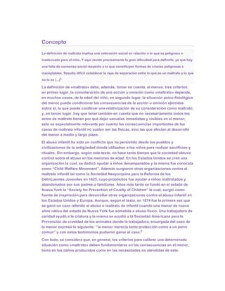 Este documento trata sobre el concepto de maltrato infantil. Define maltrato como acciones u omisiones que ponen en peligro el desarrollo físico, psicológico o emocional de un niño. Explica que el maltrato puede incluir abuso físico, negligencia, abandono o maltrato emocional. Además, discute brevemente la historia del movimiento para prevenir el maltrato infantil y proteger los derechos de los niños.