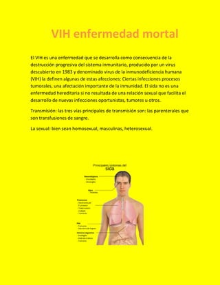 El VIH destruye el sistema inmunitario al infectarlo con un virus descubierto en 1983, lo que puede causar infecciones oportunistas, tumores u otras afecciones graves. Se transmite principalmente a través de relaciones sexuales sin protección, transfusiones de sangre y el uso de agujas. El VIH es una enfermedad mortal si no se trata.