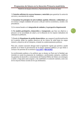 Este documento propone mejoras futuras para la Atención Primaria madrileña. Plantea mantener la titularidad y gestión públicas, dotar de recursos suficientes, y establecer un modelo participativo y transparente. También sugiere mejorar la estructura de los centros de salud, dotar de autonomía a la gestión de cada centro, y otorgar un mayor reconocimiento a los profesionales.