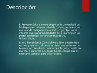 Sakai es un entorno de código abierto desarrollado originalmente por las universidades de Michigan e Indiana para integrar diversas herramientas de aprendizaje en línea en un portal académico. Ofrece funciones como gestión de cursos, tareas, exámenes, colaboración y portafolios de estudiantes. Más de 100 universidades usan Sakai actualmente. Es una herramienta flexible, escalable y de código abierto basada en Java, aunque su curva de aprendizaje puede ser empinada.