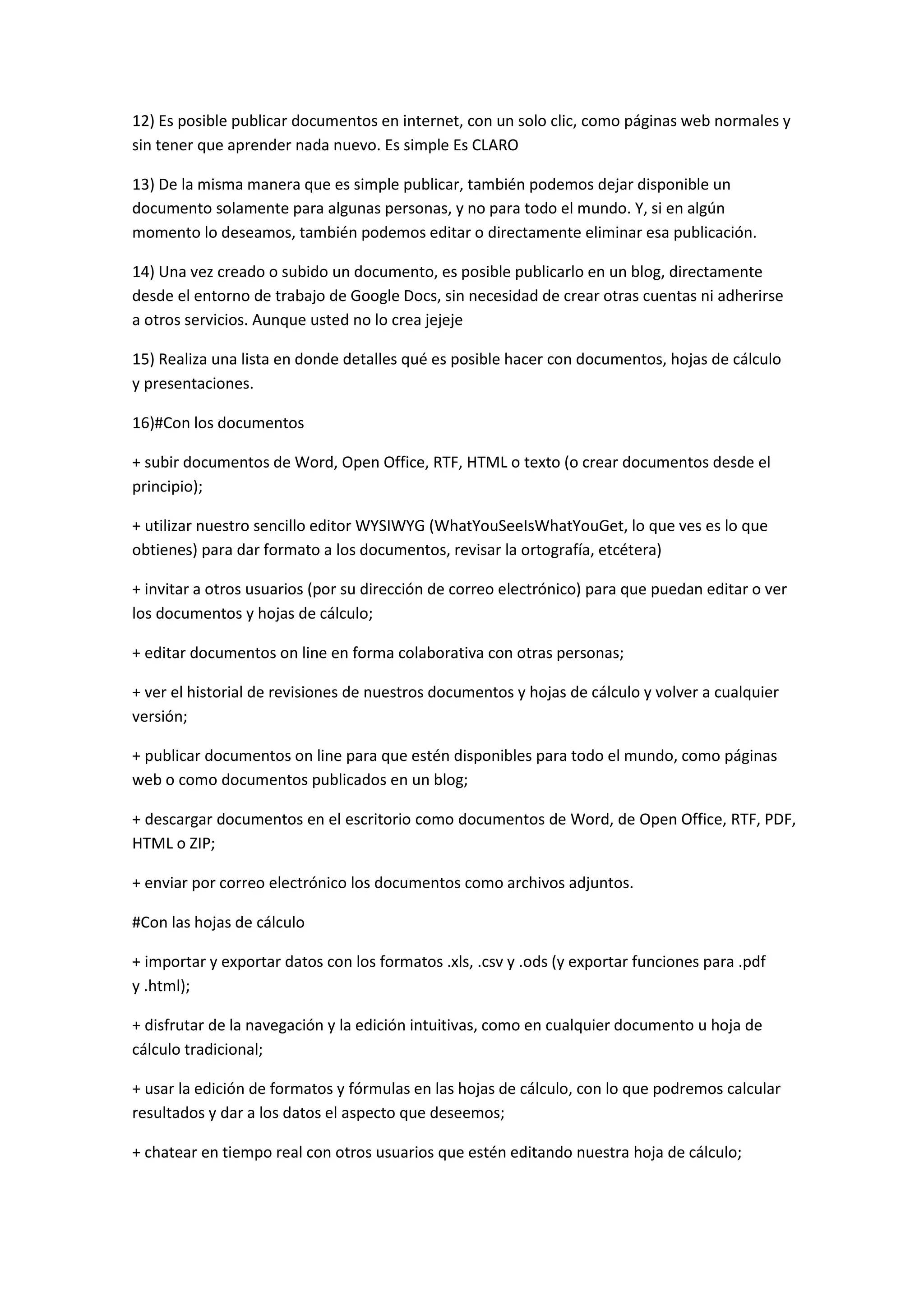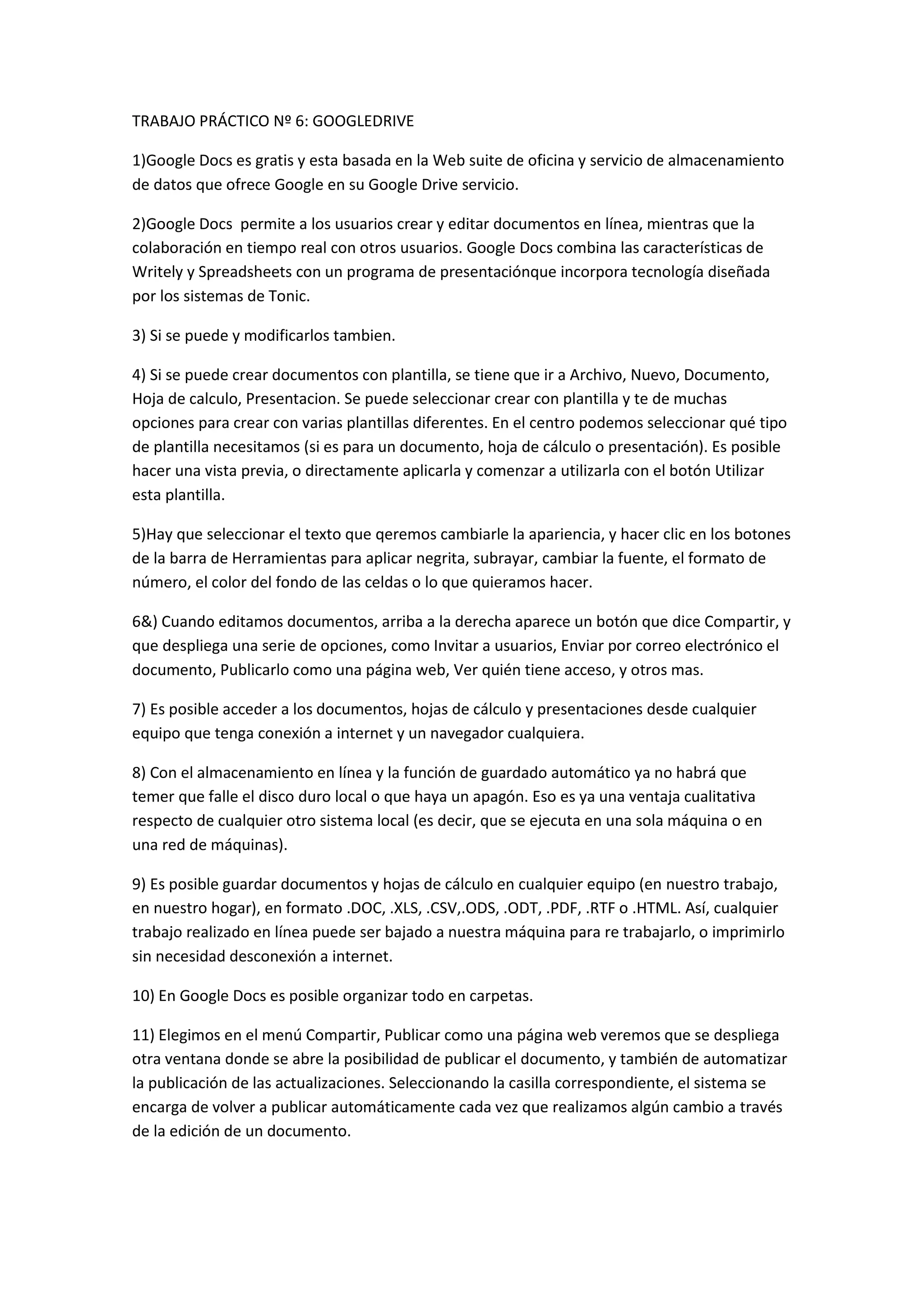 Google Drive permite crear, editar y almacenar documentos, hojas de cálculo y presentaciones en la nube de forma colaborativa. Los usuarios pueden compartir, publicar y descargar archivos en diferentes formatos. También es posible organizar los archivos en carpetas y acceder a ellos desde cualquier dispositivo con conexión a Internet.
